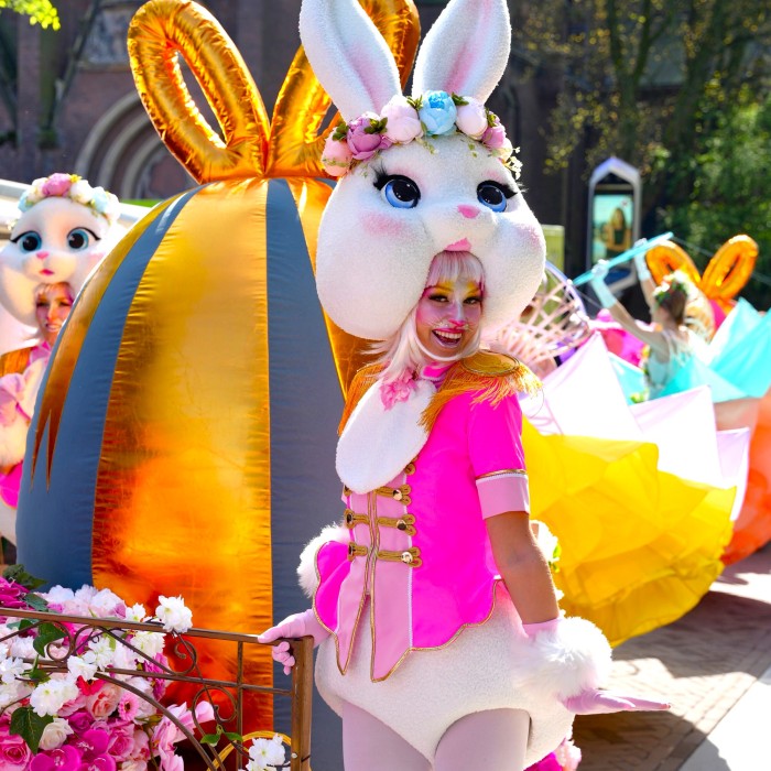 Daarnaast zijn de exclusieve Art in Motion dansers een ware eyecatcher in deze themawereld. Zij transformeren van slank bloemkarakter naar een 2,5m grote 3D bloem. Prachtig draaiend in de wind ontmoeten zij meer paashaas figuren. Luxe gespiegelde varianten of knuffelbare konijnen die graag met iedereen op de foto gaan.