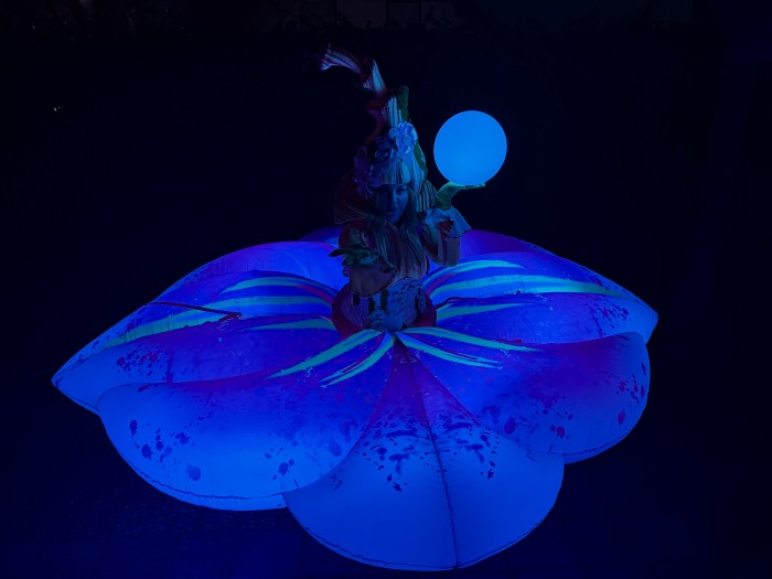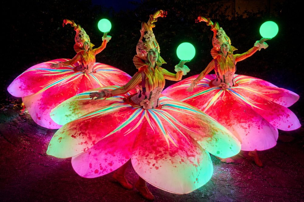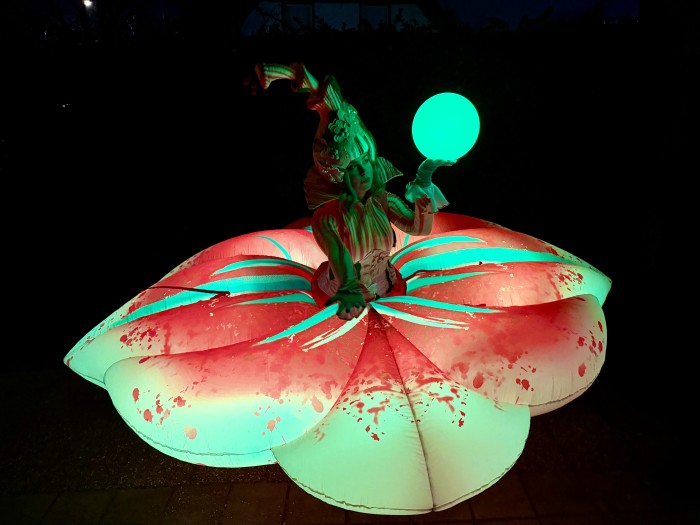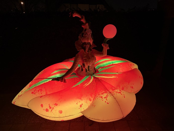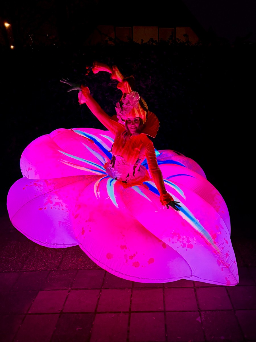 Een betoverend, groots (3m), lichtgevende bloemkarakter die sierlijk openbloeit in het donker en het publiek meeneemt in een wereld van kleur, verwondering en magie.