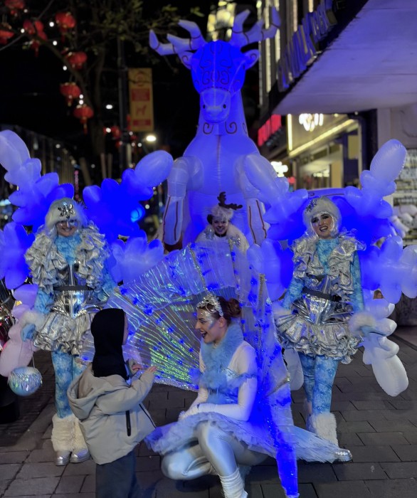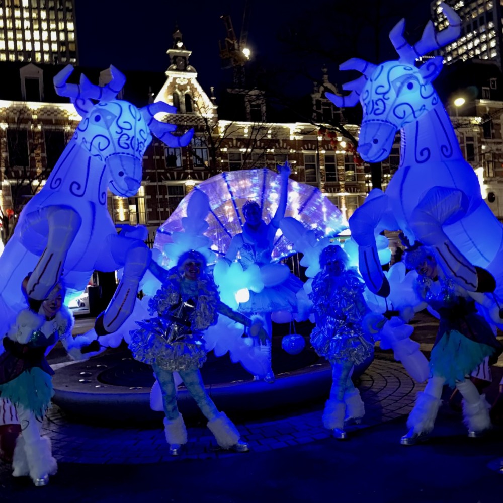 • 5 artiesten | 2x Giant Snowflake + 1x LED Ballerina + 2x Giant Reindeer (met mobiele muziek installatie)