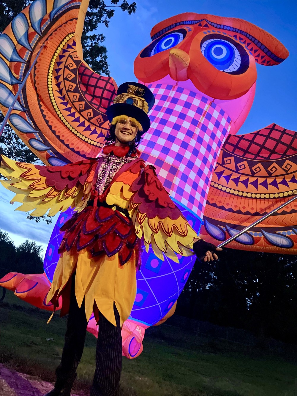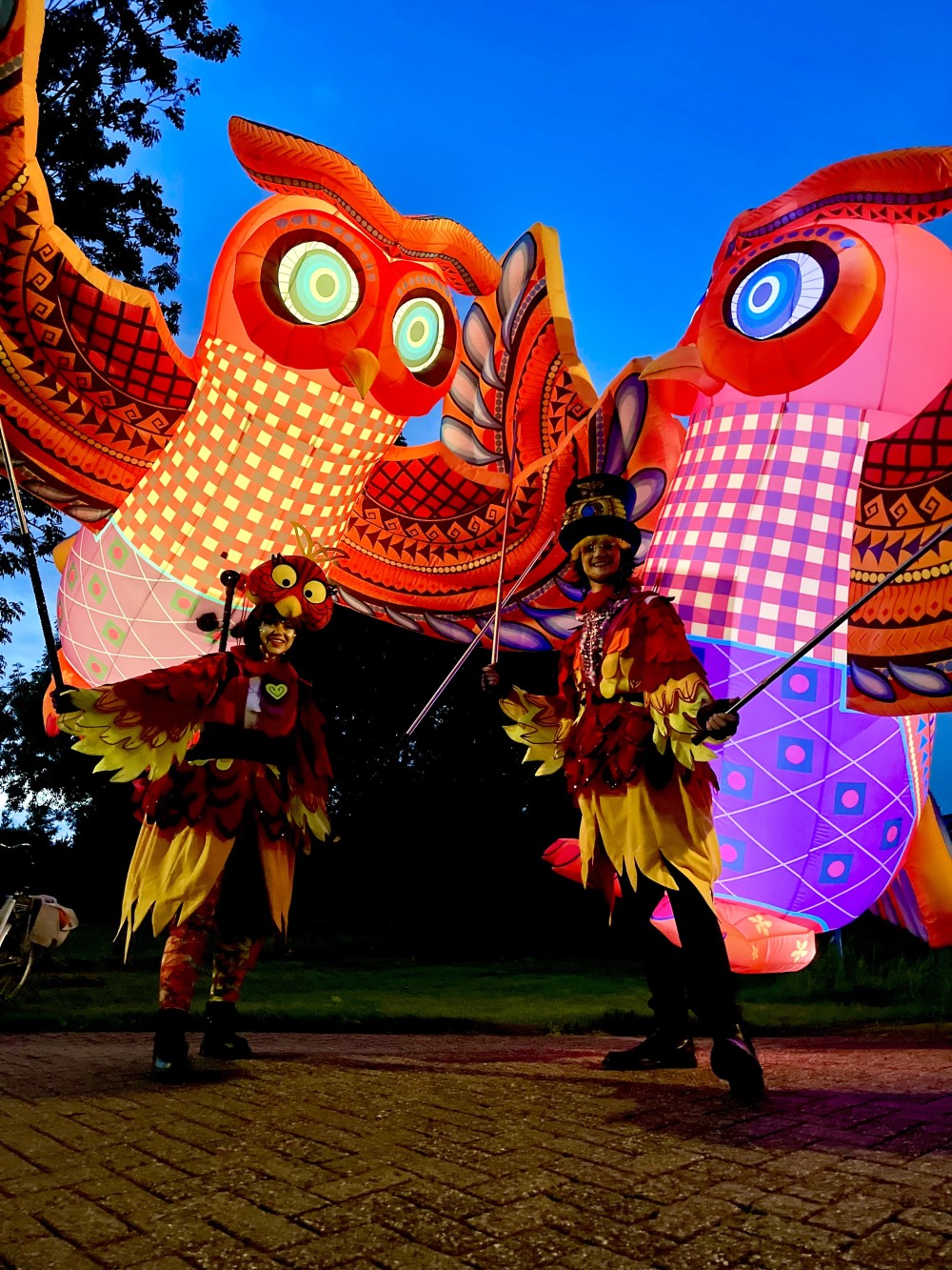 Deze kleurrijke Reuzenuil is een betoverende straattheateract die het publiek meeneemt in de magie van het bos. Deze verlichte, reusachtige uil is uniek ontworpen en komt tot leven door een performer in een prachtig uilenkostuum, die de majestueuze bewegingen van de vogel op de grond begeleidt. Met levendige kleuren en sfeerverlichting straalt de uil een magische energie uit, en glowt hij ook prachtig in donkere settingen zoals bij avondshows of tijdens de donkere wintermaanden.